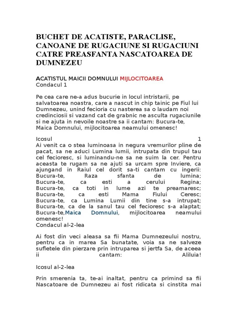 Dacă doriți să ajutați acest proiect, vă rugăm să ne contactați prin email. Textele au fost adunate din diverse surse pe care nu le pomenim aici datorita multimii lor. Acatistul de mulţumire „slavă lui dumnezeu pentru toate!". Dacă doriți să ajutați acest proiect, vă rugăm să ne contactați prin email. Cărțile pot fi transformate foarte ușor în orice alt format aveți nevoie (word doc, html, fb2, etc. Acatistul preasfintei nascatoare de dumnezeu pentru icoana ei facatoare de minuni „cauta la smerenia". Biserici si manastiri din romania; Prin numele de acatist se înţelege rugăciune citită în picioare, deci este o. Textele au fost adunate din diverse surse pe care nu le pomenim aici datorita multimii lor.