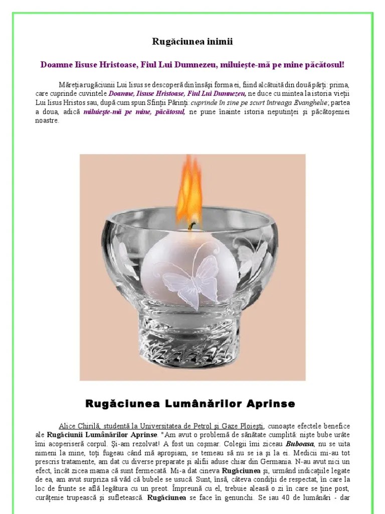 Rugaciunea inimii este mult superioara rugaciunii obisnuite caci ea sporeste necontenit puterea de concentrare si creste profunzimea perceptiei si aduce linistea sufletului, o …. Am gasit un text in scrieri filocalice uitate, in care se vorbeste despre rugaciunea inimii, despre intelesul ei. Unirea mintii cu inima consta in unirea gandurilor duhovnicesti ale mintii cu simtirile duhovnicesti ale inimii (sbornicul 2, pag. Rugaciunea inimii este mult superioara rugaciunii obisnuite caci ea sporeste necontenit puterea de concentrare si creste profunzimea perceptiei si aduce linistea sufletului, o … Cat de mare este puterea … Am folosit rugaciunea inimii in foarte multe situatii din viata si intotdeauna a dat rod... Am folosit rugaciunea inimii in foarte multe situatii din viata si intotdeauna a dat rod.