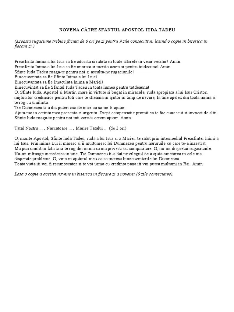 O, sfinte iuda tadeu, ruda a domnului nostru iisus hristos, apostol si martir glorios, stralucit in virtuti si puternic in minuni, credincios si grabnic ajutator al celor ce te. .. Sfinte apostol iuda tadeu, cu smerenie cad in fata ta si te rog ca sa randuiesti ca aceste rugaciuni sa ajunga la cei care au cea mai mare nevoie de ele.