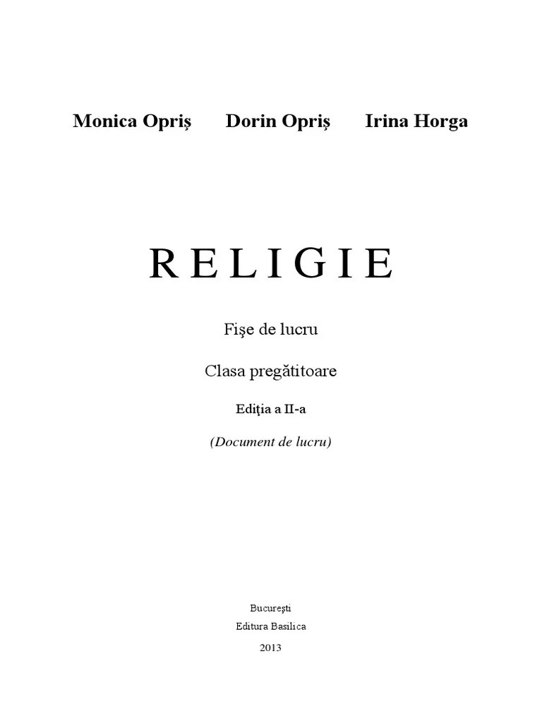 La editura basilica a patriarhiei romane a fost publicat setul de 26 de fise de lucru la disciplina religie, pentru elevii de la clasa pregatitoare, materiale didactice care au binecuvantarea preafericitului parinte daniel, patriarhul bisericii ortodoxe romane si avizul ministerului.. Religia la clasa pregatitoare si la clasa i. 2102/septembrie 2013 coordonatori ai proiectului „religia la clasa pregătitoare": Fişe de lucru clasa pregătitoare. Materiale didactice pentru clasa pregatitoare si clasa i... La editura basilica a patriarhiei romane a fost publicat setul de 26 de fise de lucru la disciplina religie, pentru elevii de la clasa pregatitoare, materiale didactice care au binecuvantarea preafericitului parinte daniel, patriarhul bisericii ortodoxe romane si avizul ministerului.