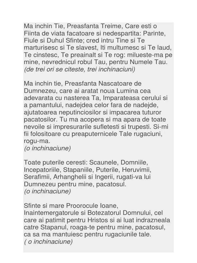 Te rog fierbinte pe tine, tata ceresc, pe tine iisuse hristoase, fiul lui dumnezeu, pe tine sfinte duh, in fata ta, preasfanta treime si a maicii preacurate, imi cer iertare pentru tot ce am gresit fata de intreaga ta creatie divina, cu gandul, cu vorba sau cu fapta, cu stiinta sau fara de stiinta, cu voie sau fara de voie,. Te rog fierbinte pe tine, tata ceresc, pe tine iisuse hristoase, fiul lui dumnezeu, pe tine sfinte duh, in fata ta, preasfanta treime si a maicii preacurate, imi cer iertare pentru tot ce am gresit fata de intreaga ta creatie divina, cu gandul, cu vorba sau cu fapta, cu stiinta sau fara de stiinta, cu voie sau fara de voie,. Puterile trinității divine au darul de a tămădui sufletele aflate în nevoie și de a aduce alinare la vreme de necaz. Si acum si pururea si in vecii vecilor.